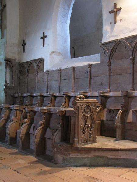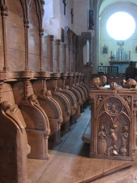 Les jouées des stalles hautes côté nef sont ornées de 3 scènes de la vie de la Vierge : à droite, encadrée par un motif architectural reprenant le dessin d'une baie composée à 2 lancettes, l'Annonciation et à gauche, dans 2 quadrilobes superposés, la Visitation et la Nativité. Les dossiers des stalles hautes ont été laissés nus mais sont décorés d'arcatures trilobées. Les jouées des stalles basses sont sculptées aussi bien côté nef que côté choeur de scènes empruntées à la vie de saint Jean l'Evangéliste, patron de l'église : sous des arcatures reprenant le dessin d'une baie composée à 2 lancettes, la Cène et le martyre du saint (côté nef) puis la préparation suivie de la dégustation de la coupe empoisonnée et la mort d'un personnage tonsuré (côté choeur). Les dessus de chaque jouée ainsi que les miséricordes sont décorées par des petites figures caricaturales