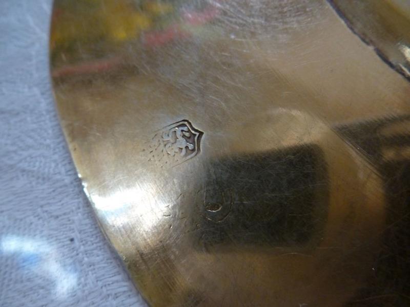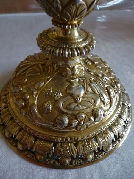 poinçons (sous la fausse coupe et sur la patène) : poinçon de maître : écu de la ville d'Autun surmonté des lettres A et B (maître Antoine Baudot) , poinçon de communauté : lettre Q couronnée (communauté d'Autun vers 1647 ) ; inscription (gravée sous la bâte du pied) : M. PIERRE LEVITTE 1647