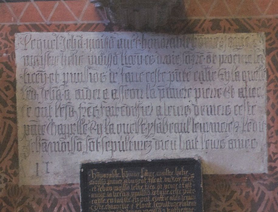 plaque commémorative de la fondation de l'église par Jehan et Hélie Moisson