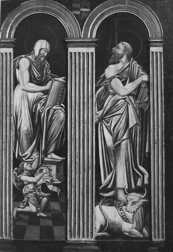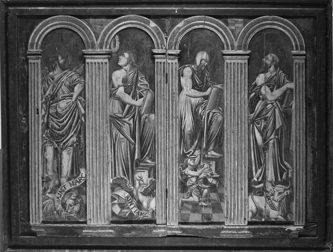 au revers des panneaux : les évangélistes et leur symbole sous arcatures (à gauche : saint Matthieu et saint Luc, à droite : saint Marc et saint Jean)