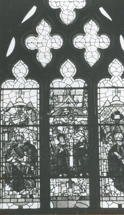 verrière de la baie 0 : saint Pierre, le Christ entre la Vierge et saint Jean, saint Marc