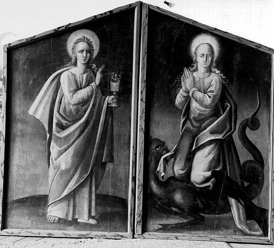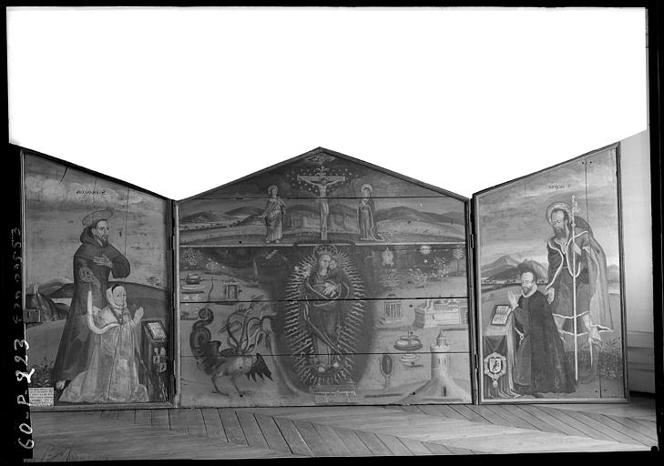 Panneau central : les litanies de la Vierge avec la crucifixion au registre supérieur ; sur les volets : les abbés donateurs et leurs saints patrons ; au revers des volets : sainte Marguerite et saint Jean l'Evangéliste