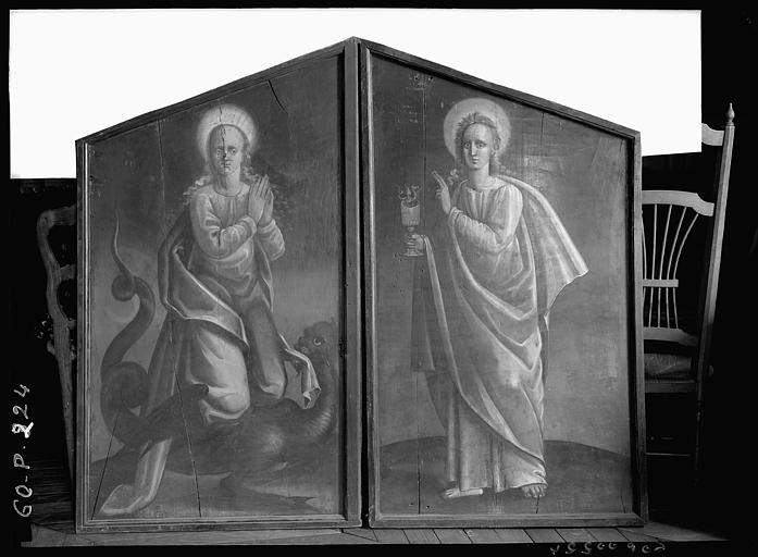 Crucifixion ; homme : Beugre Jacques de : en donateur, saint Jacques le Majeur ; homme : Beugre François de : en donateur, saint François d'Assise ; sainte Marguerite ; saint Jean l'Evangéliste