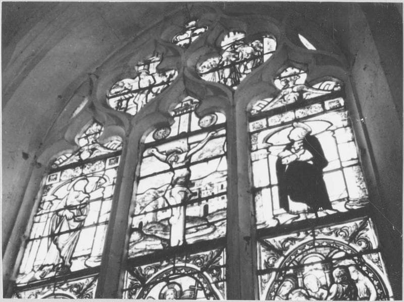 verre transparent (coloré) : grisaille sur verre, jaune d'argent ; plomb (réseau)