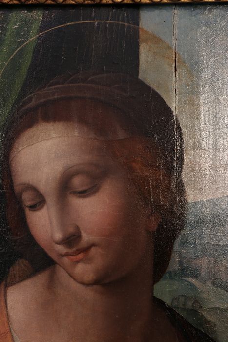 Récolement du 08/11/2017 : manque de matière sur le bord inférieur droit du cadre (au niveau de l'angle) ; éclats de la dorure sur le bord supérieur de la traverse basse du cadre ; fente du panneau au niveau de l'arrière de la tête de la Vierge ; panneau cintré : panneau sorti des fixations du cadre, nécessite l'intervention d'un conservateur-restaurateur pour refixer correctement le panneau.