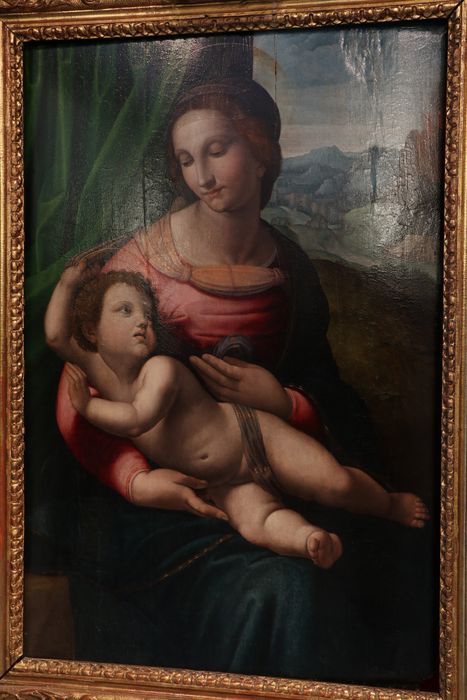 Oeuvre du 16e siècle, cadre du 18e siècle ; ce tableau est une variante de la madone Bridgewater (National Gallery of Scotland, Edimbourg) peinte par Raphaël en 1506-1507 ; mais aucun paysage ne figure sur l'oeuvre de Raphaël, bien qu'une baie en plein cintre encadrant un paysage ait été révélée par rayons X ; par contre l'auteur du tableau de Nolay y a représenté un paysage de facture flamande ; une autre variante est conservée à l'église de Drée (21), probablement l'oeuvre du même artiste flamand ; un tableau identique est conservé à Messigny (21), mais en mauvais état (source : notice IM21001995).