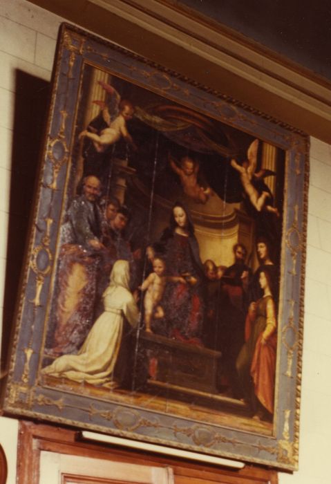 L'oeuvre est une copie du tableau de Fra Bartolommeo 'Sainte conversation avec le Mariage mystique de sainte Catherine de Sienne', exécutée en 1511 pour le couvent San Marco de Florence. Cette oeuvre fut achetée dès 1512 par les représentants de la République de Florence pour être offerte à Jacques Hurault, évêque d'Autun et ambassadeur du roi à Florence. Celui-ci en fit don au Chapitre de la Cathédrale d'Autun qui le plaça dès 1512 dans la sacristie. Le tableau de Saulieu a été peint par André Menassier. Ce peintre connu une certaine renommée à la fin du 16e siècle et au début du 17e siècle en Bourgogne comme en témoignent les commandes des ecclésiastiques, des parlementaires locaux et de quelques grandes familles aristocratiques, tels les Clermont-Tonnerre pour le décor de la chapelle du château d'Ancy-le-Franc. L'oeuvre de Saulieu se situe parmi les première productions datées de l'artiste. Aucune indication à ce jour concernant le commanditaire du tableau. Au regard des grandes dimensions de l'oeuvre et de sa complexité, le destinataire ne pouvait être q'un personnage éminent, parlementaire ou ecclésiastique. Il n'existe pas de document attestant de son arrivée à Saulieu, l'oeuvre n'est pas décrite dans les procès-verbaux révolutionnaires des inventaires faits dans la chapelle de l'hospice à la fin du 18e siècle. Ce tableau a vraisemblablement été exécutée sur ordre de l'évêque d'Autun pour l'église Saint-Andoche ou la chapelle des Ursulines de Saulieu.