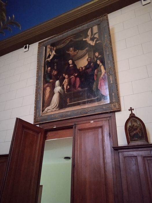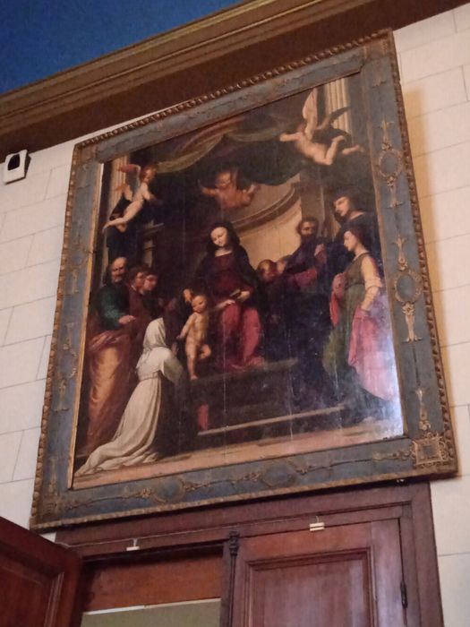 scène (Vierge à l'Enfant, sainte Catherine d'Alexandrie : symbole : mariage religieux, saint Pierre, saint Vincent, saint Etienne, saint Dominique, saint François, saint Barthélémy, saint Laurent)