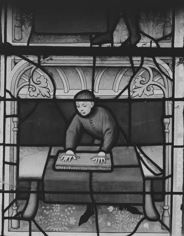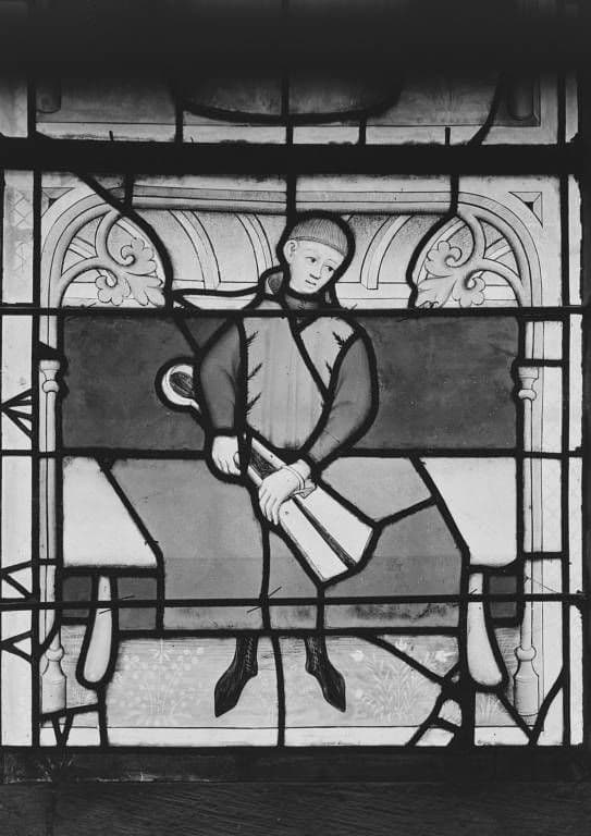 verre transparent (coloré) : grisaille sur verre, jaune d'argent ; plomb (réseau)