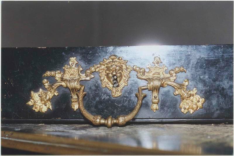 hêtre : vernis (noir) ; sapin ; bronze : doré ; cuir
