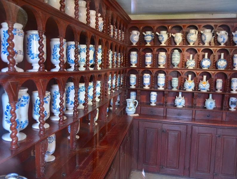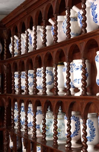 Le corps inférieur du meuble couvrant les murs de la pièce est composé de placards fermés par des portes. Le corps supérieur comporte un niveau de tiroirs et quatre niveaux d'étagères formées de fausses niches à colonnettes torses abritant des pots à pharmacie. Un autre meuble prend la forme d'un buffet : la partie inférieure présente deux tiroirs et deux placards fermant par un battant, tandis que la partie supérieure est constituée de deux rangées de fausses niches à colonnettes torses.