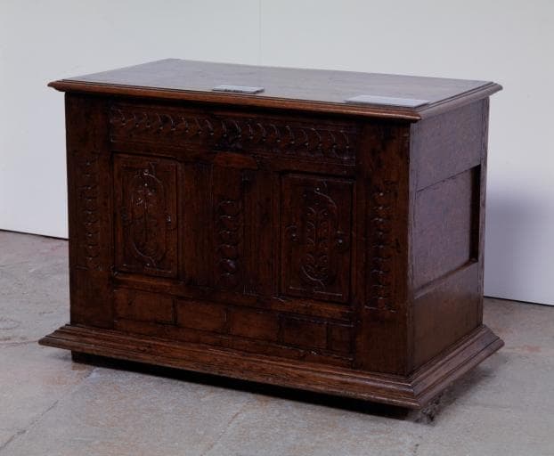 chêne : taillé (décor en bas-relief) ; fer (garniture) : forgé