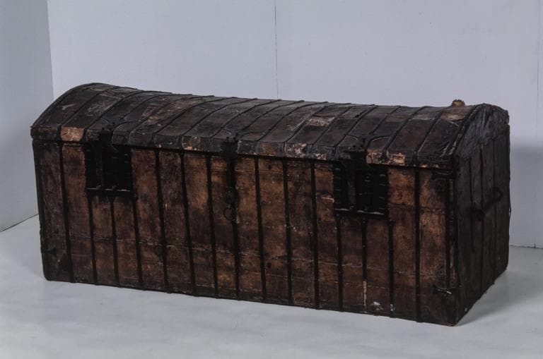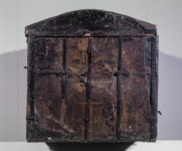 sapin (structure, intérieur) : taillé ; peau (garniture, extérieur) : peint ; matériau textile (garniture, intérieur) : toile ; fer (garniture) : forgé, découpé, décor poinçonné