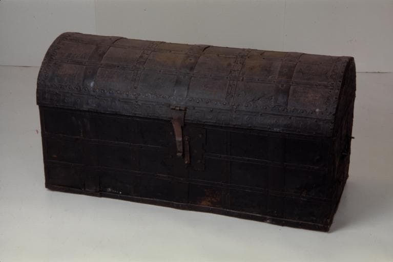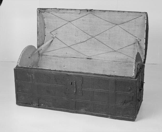 hêtre (structure, intérieur) : taillé ; cuir (garniture, extérieur) ; matériau textile (garniture, intérieur) : toile ; fer (garniture, extérieur) : forgé, poinçonné motif en creux, repoussé