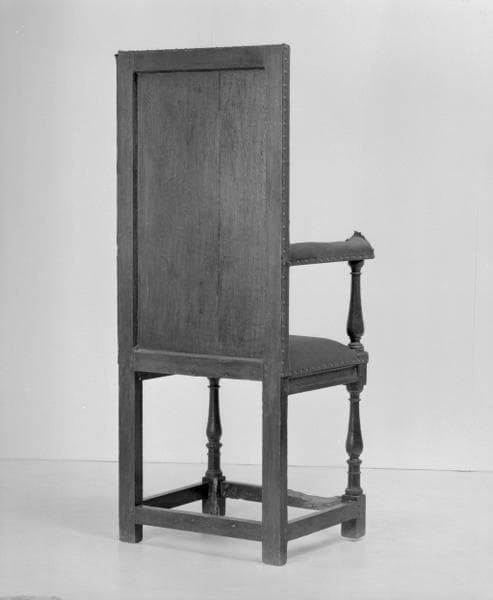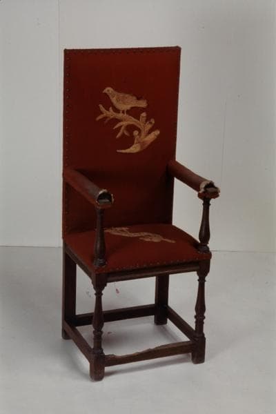 chêne : taillé, mouluré petit cadre, tourné ; vernis ; matériau textile (garniture) : brodé