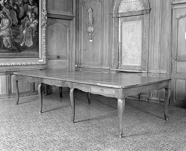noyer : taillé, chantourné ; fer (garniture) : forgé, découpé