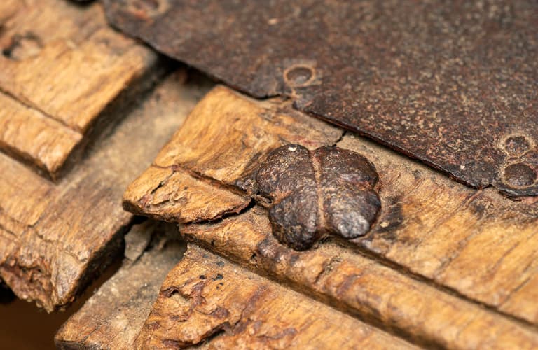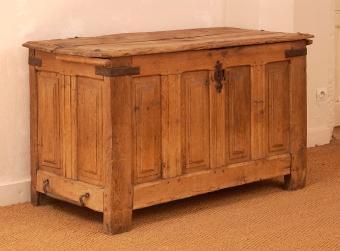 chêne : taillé, mouluré ; fer (garniture) : forgé, découpé