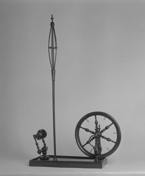 Rouet à transmission horizontale, épinglier et porte-quenouille.