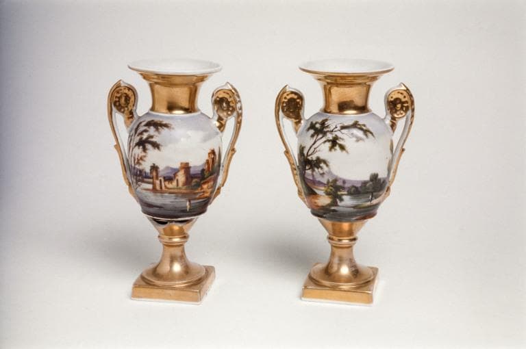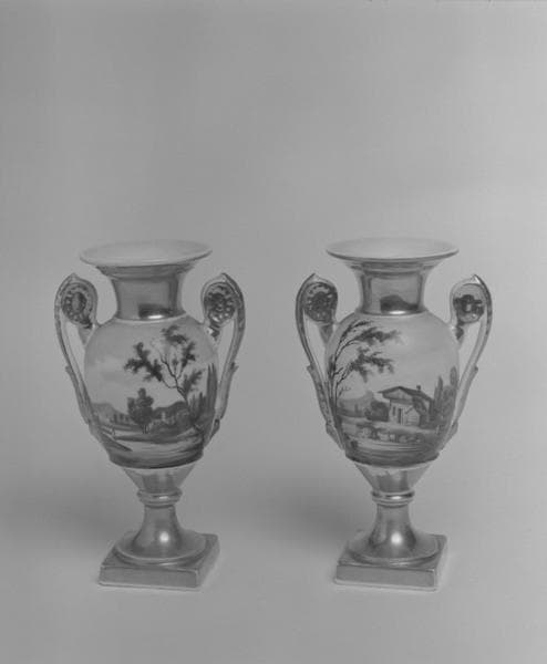 Vases en porcelaine de Paris en forme d'urnes ornées de paysages.