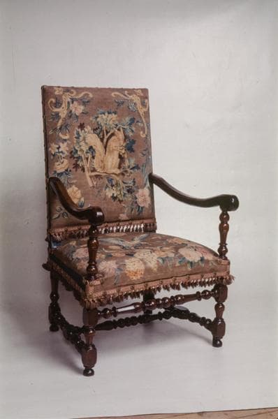 noyer : taillé, tourné, teint ; matériau textile (garniture) : textile peint