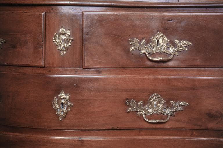 noyer : taillé, petit cadre élégi, chantourné ; fer (garniture) : forgé ; bronze (garniture) : fondu