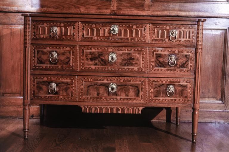 noyer (ronceux) : taillé, tourné, placage ; bois fruitier : taillé ; bois : marqueterie à filets composés ; fer (garniture) : forgé ; bronze (garniture) : fondu