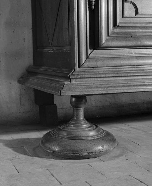 noyer : taillé, tourné, chantourné, cadre totalement mouluré, mouluré petit cadre ; fer (garniture) : forgé, étamé