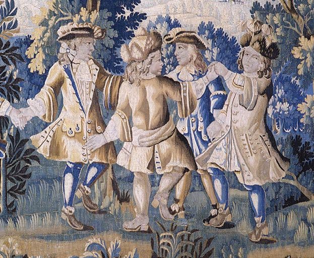 jeunes gens : danseur, musicien, fond de paysage ; rinceau ; fleur ; feuille ; oiseau