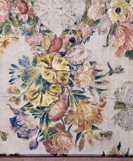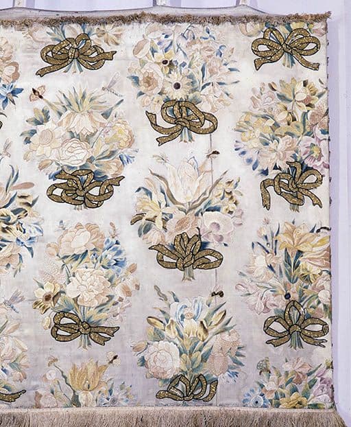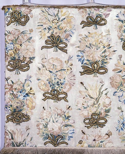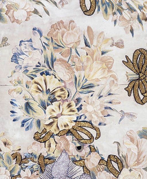 soie : satin, brodé ; lin : toile ; soie ; pâte de verre : doré