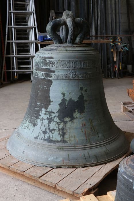 grosse cloche : inscription très lisible, note : La. Moyenne cloche : inscription, note : Fa