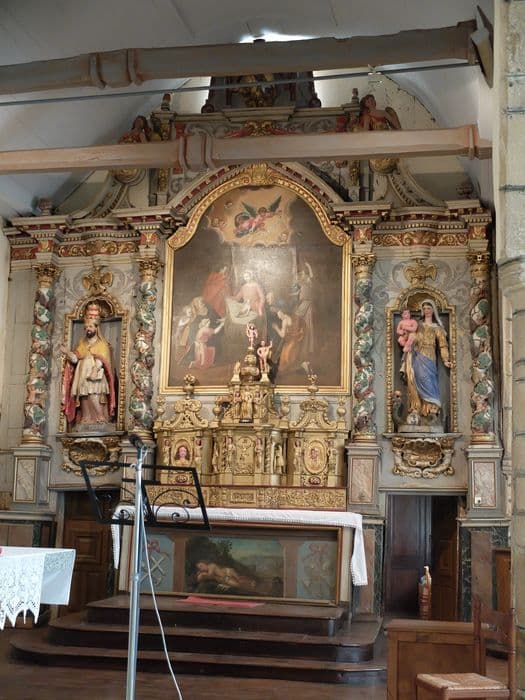 Ensemble comprenant un petit retable en bois doré et un grand retable polychrome. Le petit retable est décoré de colonnes torses, de médaillons, de statuettes, de guirlandes et de pots à feu. L'amortissement du tabernacle est couronné d'une sculpture. Le tableau du grand retable est flanqué de deux sections latérales entre des colonnes torses enroulées de pampres et de grappes.