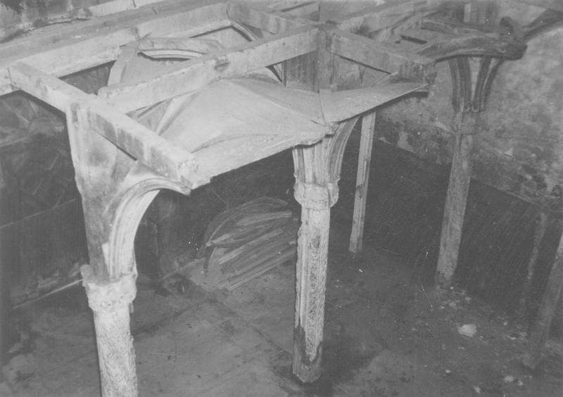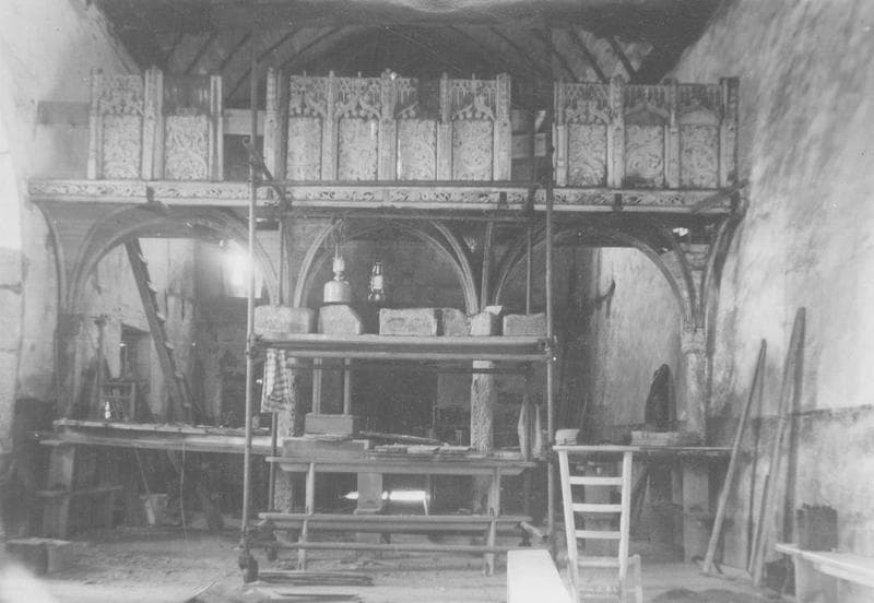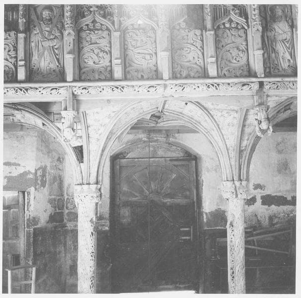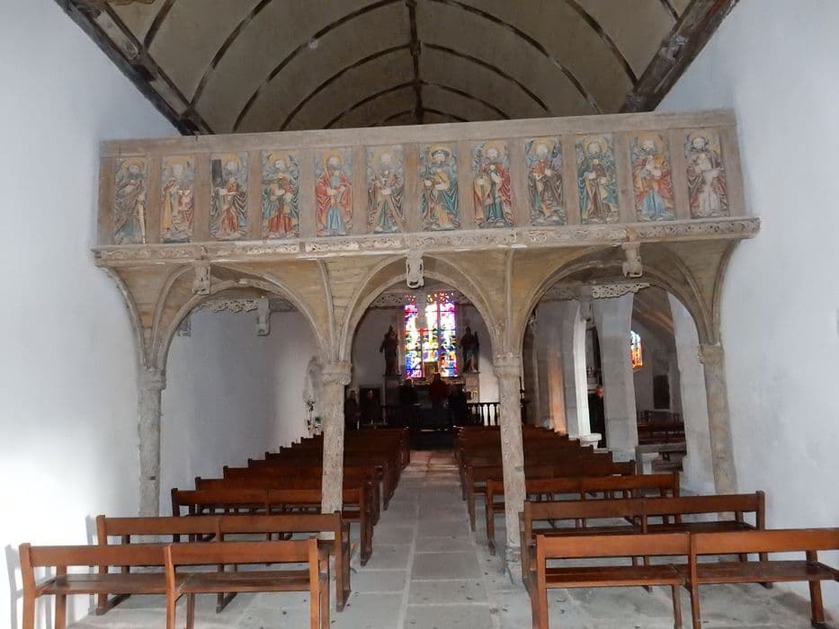Jubé servant de tribune, soutenu par trois colonnettes. La voûte est en bois peint. La façade se comose de 12 panneaux ouvragés surmontés de dais finement cécoupés. Cinq figurines pendent à la galerie ouvragée au bas des panneaux.