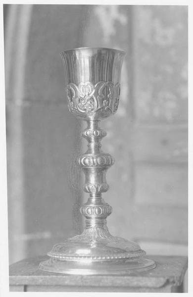 Calice en argent et patène en vermeil. Base du calice décorée de raisins et d'épis. Noeud et tige Louis XV à ornementation d'oves. Fausse coupe ajourée.