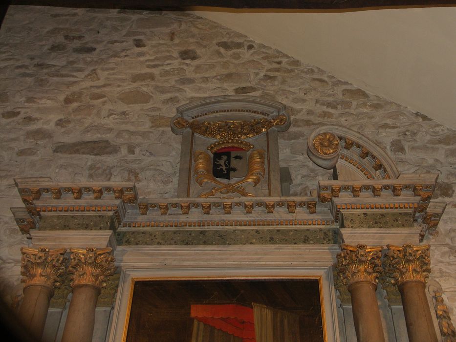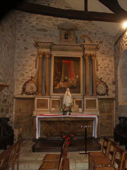 Des colonnes jumelées encadrent le tableau central. Le fronton est orné d'un écusson. Le retable est flanqué d'ailerons sculptés. La porte du tabernacle est un miroir.
