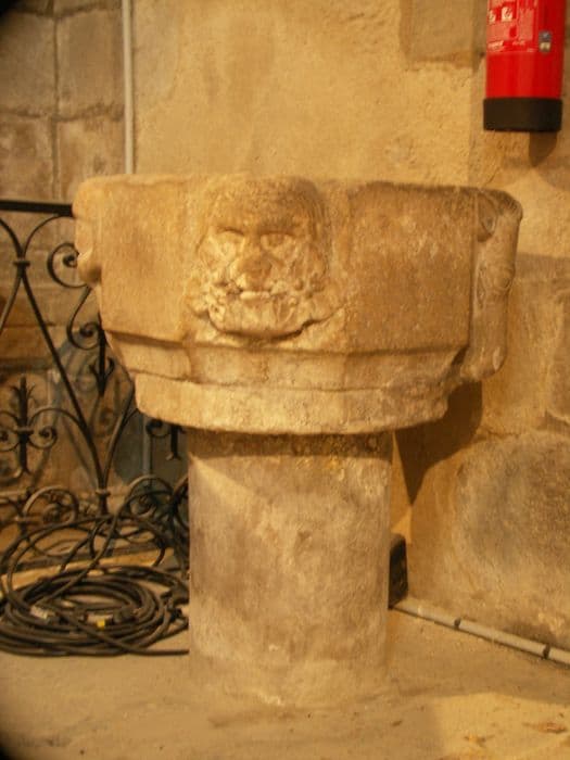 Bénitier présentant quatre mascarons sur les pan coupés d'un carré.