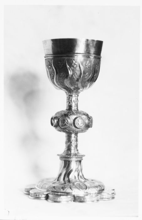 Poinçon : initiales HA séparées par un lion passant, surmontées d'une fleur de lys couronnée entre deux grains de remède (sur le rebord de la coupe). Poinçon : lette G couronnée (sur le rebord de la coupe).