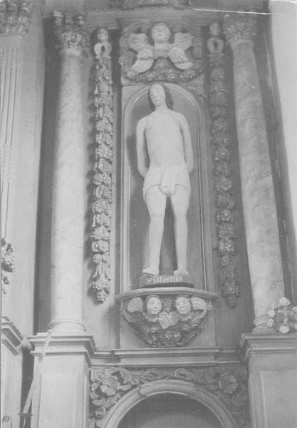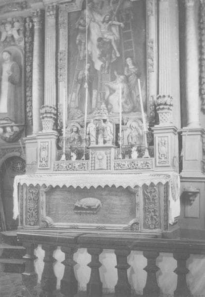 Le tabernacle est surmonté d'une couronne supportée par deux anges entre les bustes du Christ et de la Vierge en bas-relief. La niche du couronnement contient une statue. Les niches latérales, placées entre deux colonnes, au-dessus de petites portes, renferment des statues.