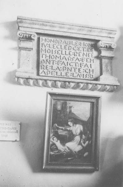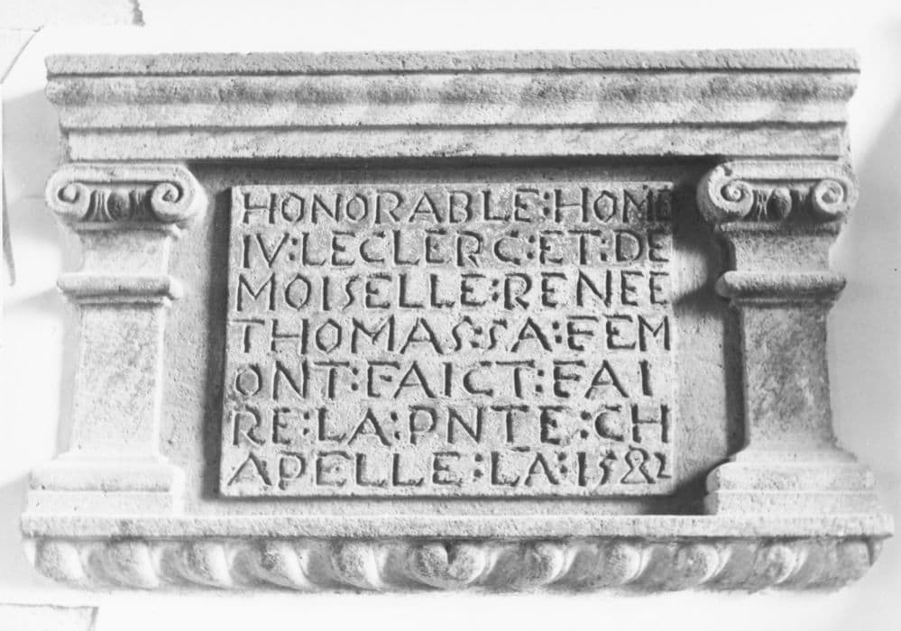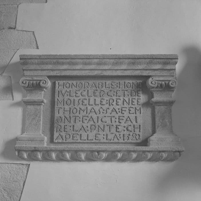 Inscription commémorative de la construction d'une chapelle, entre deux pilastres à chapiteaux ioniques.