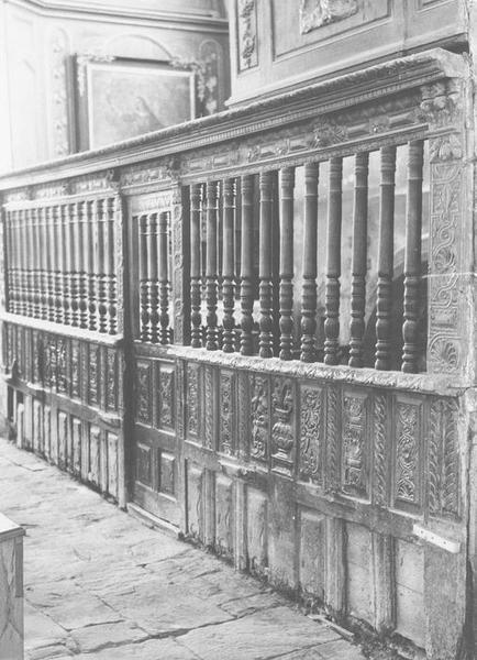 Clôture comprenant un registre inférieur composé de petits panneaux pleins. Le premier registre est surmonté d'un second couvert de sculptures. Au-dessus, s'élève une rangée de 28 colonnettes qui soutiennent une corniche. Les extrémités de la clôture et les côtés de la porte présentent de petits pilastres.