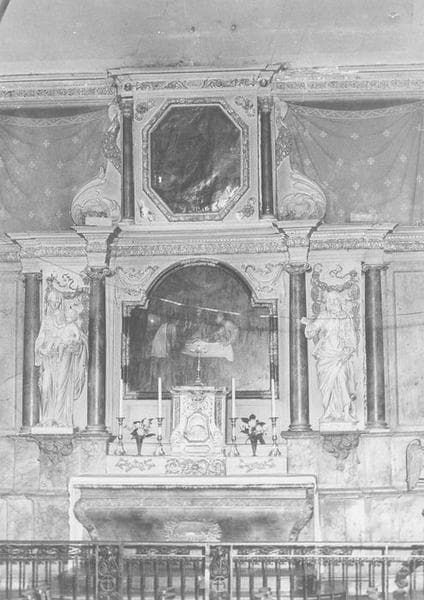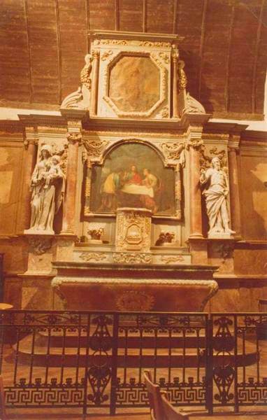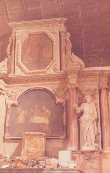 Retable à 2 étages. Au 1er étage, 4 colonnes dont 2 en avancée encadrent 2 panneaux latéraux décorés de guirlandes de fleurs et un grand panneau central comprenant une toile dans un arc en cintre surbaissé retombant sur deux colonnettes cannelées, surmontées de draperies et guirlandes. Au-dessus, un entablement à frise décorée de feuilles d'acanthes. Le 2e étage est formé d'un panneau carré encadré de volutes de feuilles d'acanthes, de feuillages et de 2 colonnettes, surmonté d'un entablemet décoré de rinceaux.