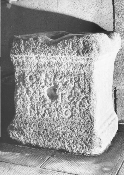 Fragment de borne millière militaire, monolithe, composée d'un dé rectangulaire supportant un chapiteau rectangulaire et supporté lui-même par une base analogue au chapiteau. Sur la face supérieure, on voit un trou cylindrique où s'insérait sans doute le milliaire.