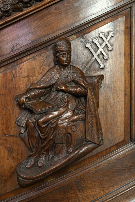 Personnages sculptés sur les panneaux et en relief aux angles.