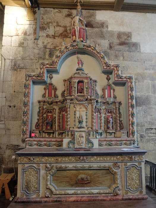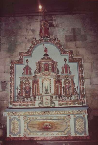 Retable composé d'une partie centrale en avancée comprenant deux étages à trois niches, flanquée de chaque côté par deux niches superposées. Des colonnettes enroulées de feuillages séparent les niches. Le tout est entouré d'un cadre de moulures ornées de feuillages et de rubans, qui se termine par un fronton en plein-cintre.