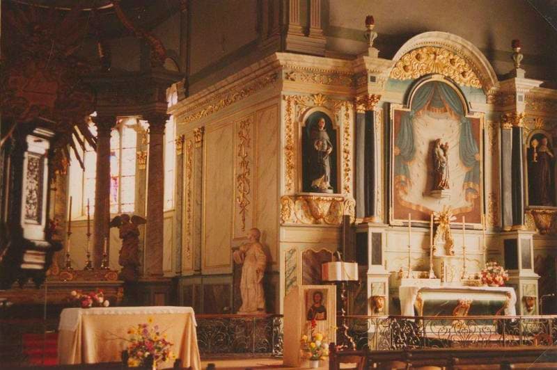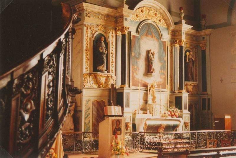 Retable Sud identique au retable Nord. grand tableau central encadré de deux colonnes. Ailes droite et gauche ornées de niches contenant des statues. Le tabernacle est surmonté de la monstrance.