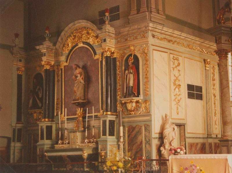 Retable Nord identique au retable Sud. grand tableau central encadré de deux colonnes. Ailes droite et gauche ornées de niches contenant des statues. Le tabernacle est surmonté de la monstrance.