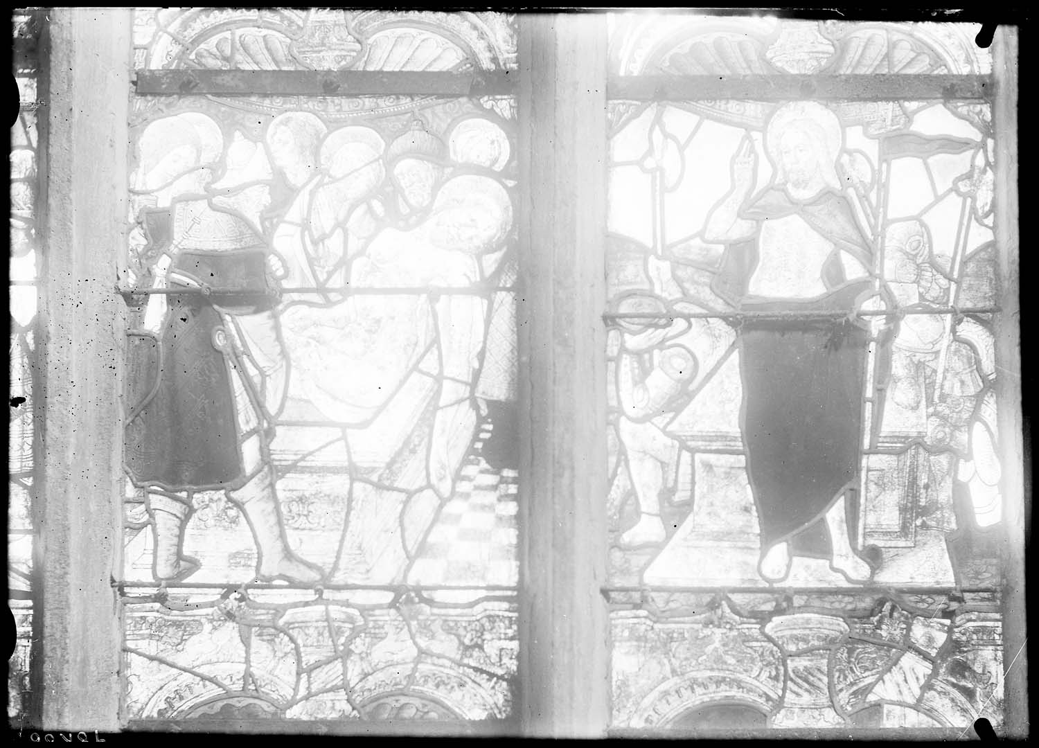 POP | Plateforme ouverte du patrimoineverrière : le Portement de croix, la Crucifixion, la Mise au tombeau, la Résurrection, l'Agonie, le Baiser de Judas, la Flagellation, Jésus devant Pilate, saint Pierre avec un donateur et une donatrice, les Rameaux, la Cène, saint Paul avec un donateur et une donatrice, ange