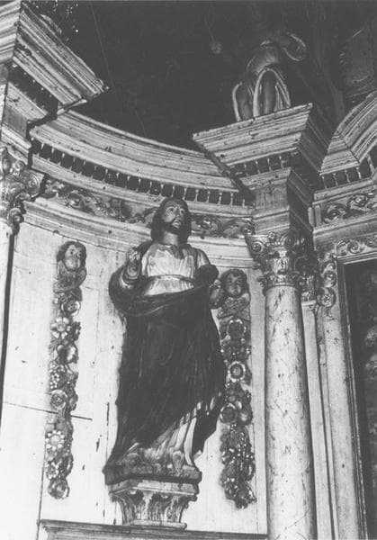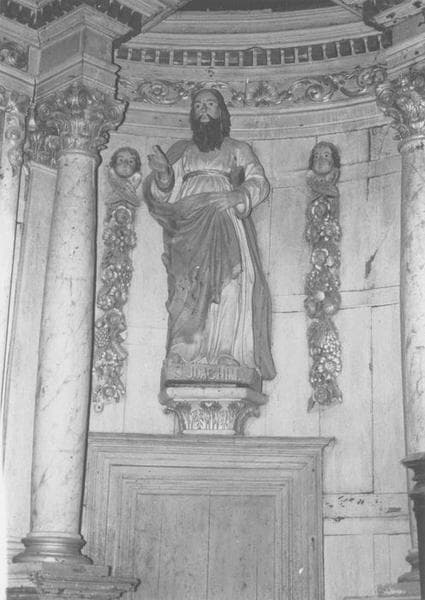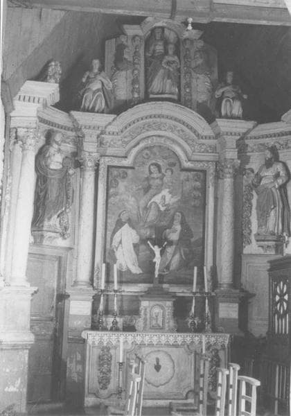 Retable à deux étages. Au premier étage, un gradin avec au centre le tabernacle, le panneau central avec un tableau encadré de deux colonnes, un entablement curviligne. ailes en retour comportant chacune une console pour les statues. Au deuxième étage, une niche centrale avec fronton curviligne, encadrée de deux angelots d'où partent des chutes de fleurs et de fruits.
