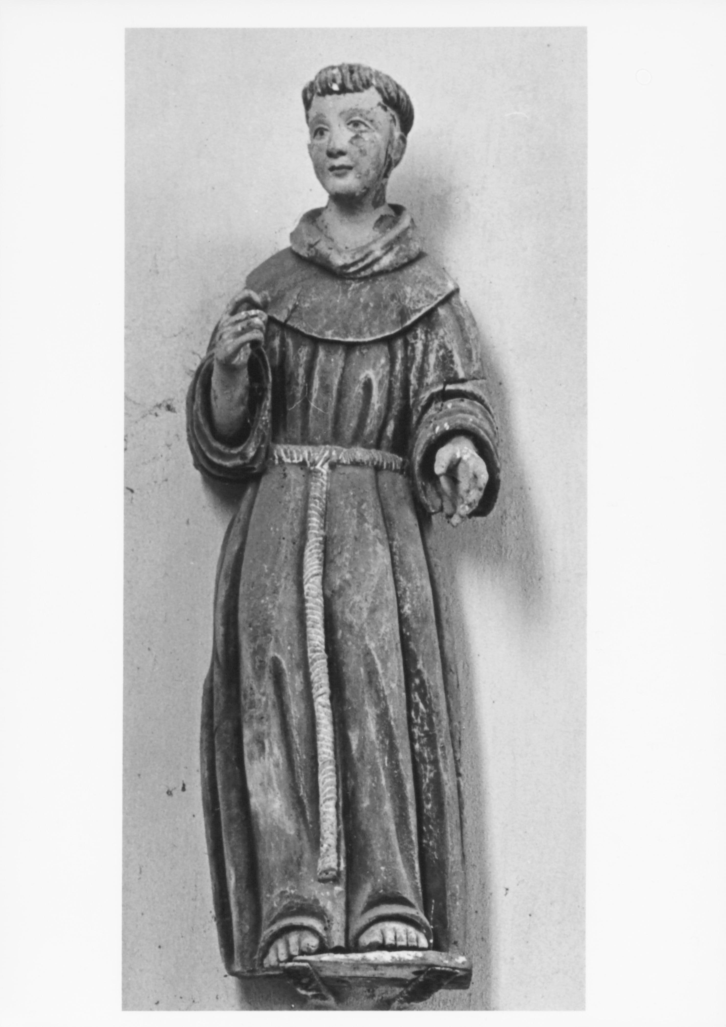 Le saint moine est représenté en pied, les mains présentent les stigmates de la crucifixion. Le personnage porte la tonte ecclésiastique, il est vêtu d'une coule marron ceinturée à la taille par une corde nouée. Le saint tenait dans sa main dextre un attribut aujourd'hui perdu.