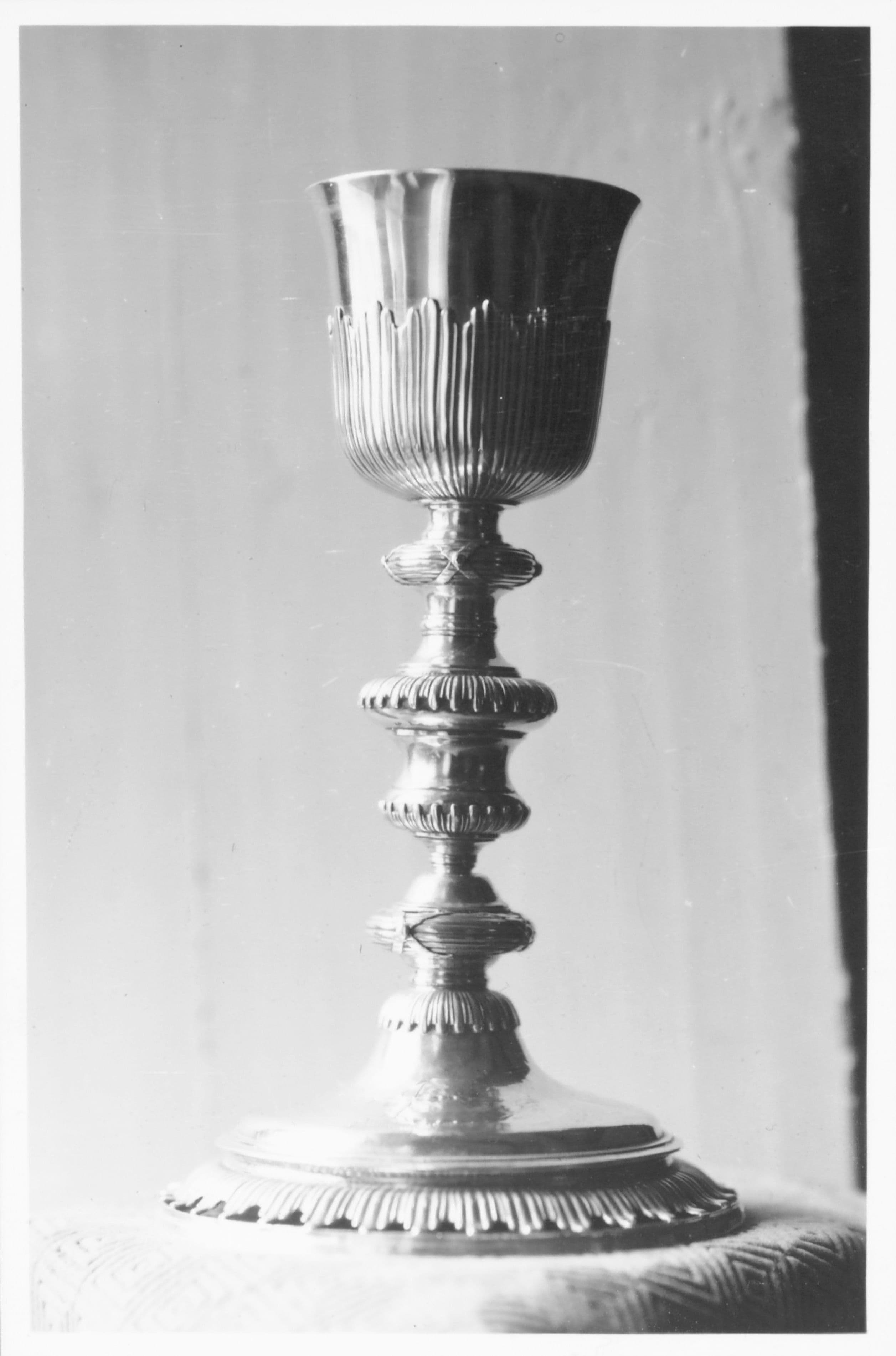 Base reperçée à godrons. Collerettes enrubannées. Noeud en forme d'urne, à godrons. Fausse coupe à godrons.
