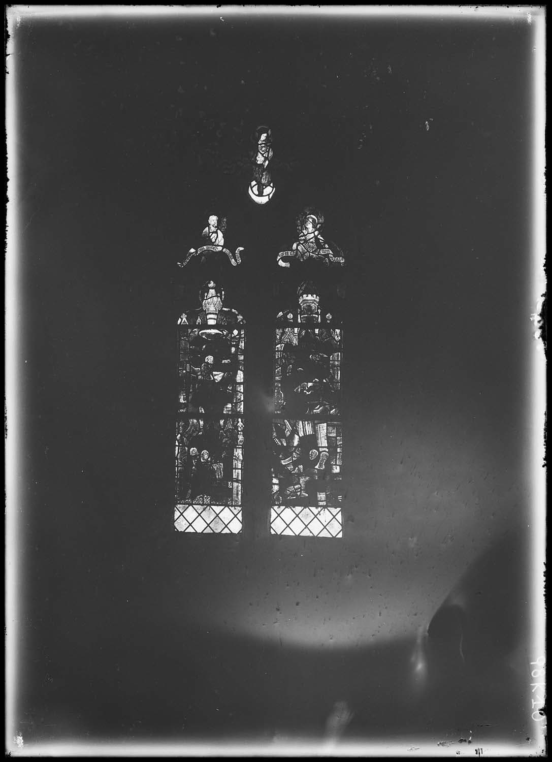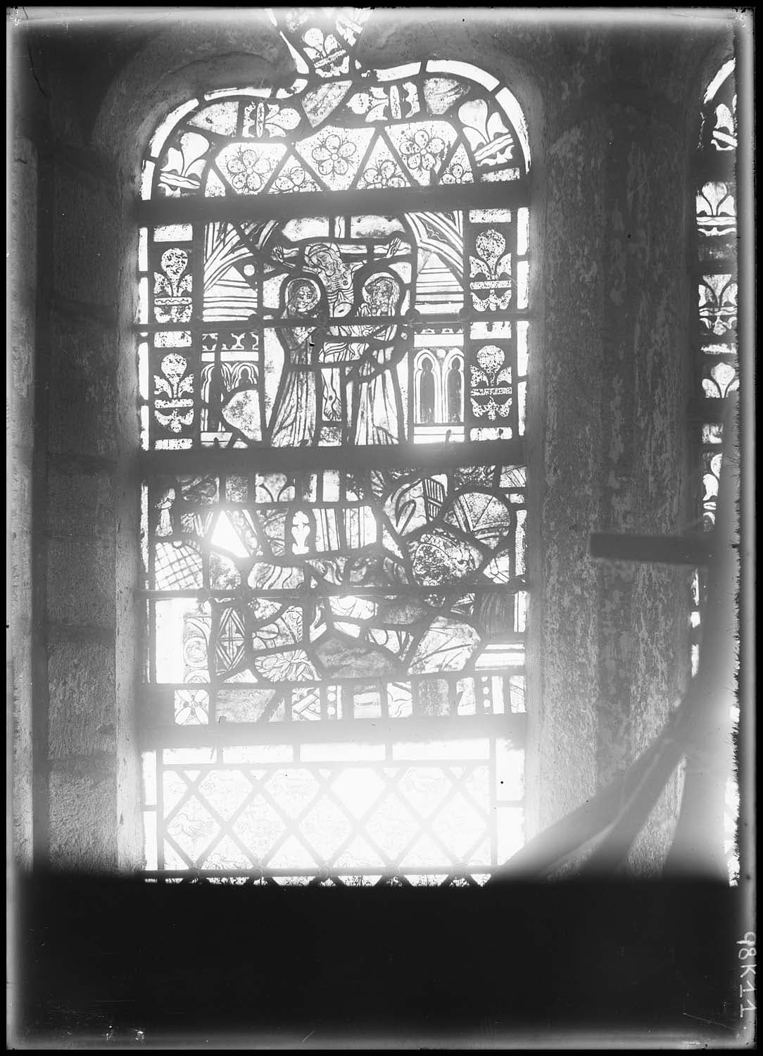 Vitrail incomplet. Dans le remplage, un quatrefeuilles et deux mouchettes trilobées. La verrière elle-même, divisée par un meneau en deux lancettes, comprend des panneaux décorés de scènes, remplacés par endroit, par des losanges avec dessins en grisaille.